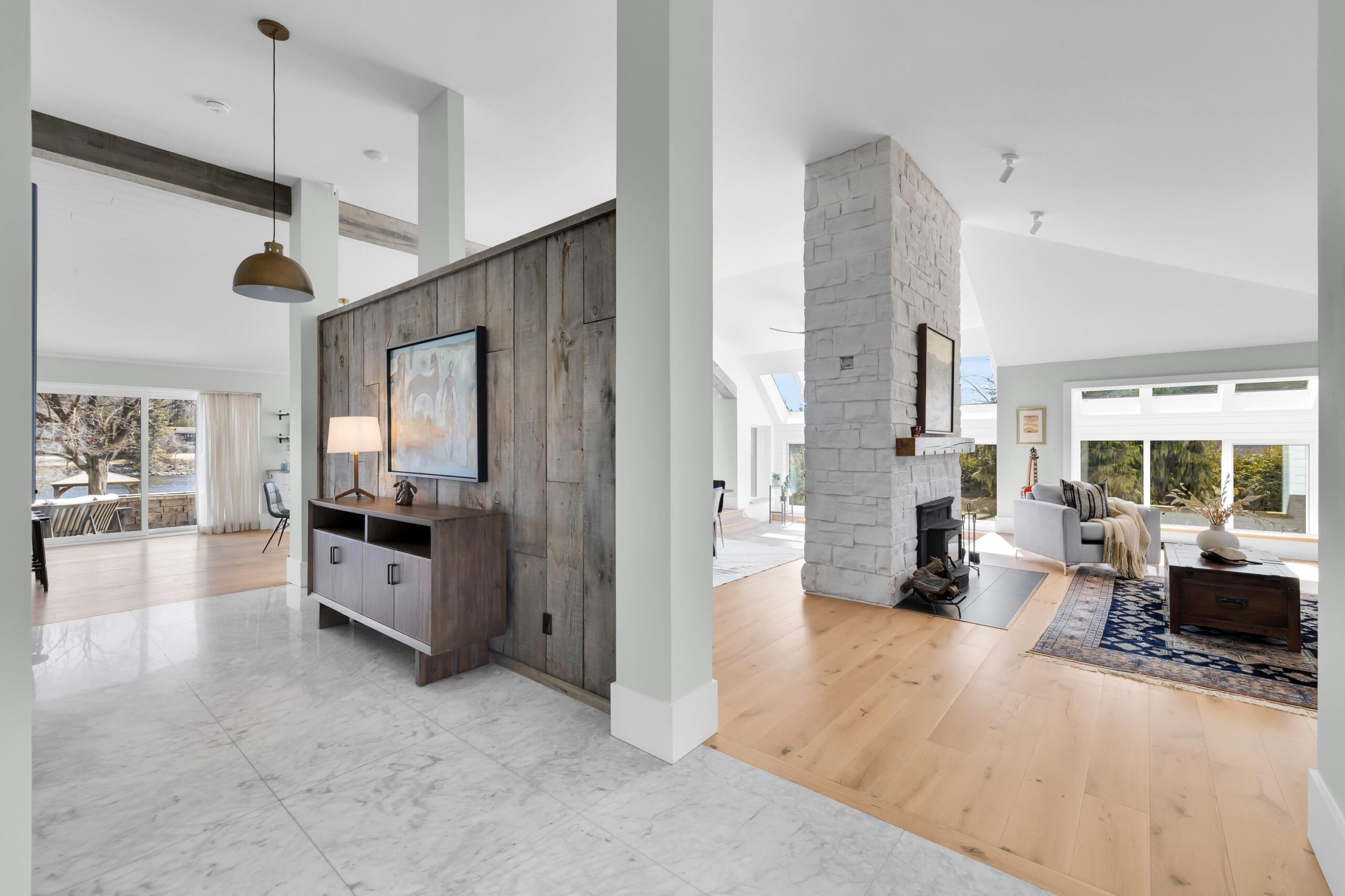 Welcome to this extraordinary, fully reimagined luxury waterfront bungalow on Manotick’s sought-after Long Island, offering over 3,200 sq ft of beautifully curated living space above grade, set against the serene backdrop of the Rideau River. Combining polished modern design with a warm, rustic undertone, finished with premium white-oak hardwood flooring that extends throughout the entire space. The principal living spaces are truly stunning, with soaring vaulted ceilings, a striking stone fireplace, and an impressive wall of skylights and windows spanning the entire wing encompassing the living room, dining room, family room & mudroom – bathing the home in natural light while framing captivating river views. The Chef’s kitchen is complete with premium SS appliances, Dekton countertops, a centre island with breakfast bar & walk-in pantry. A thoughtfully designed layout places the bedrooms in a private wing, including a luxurious primary retreat with spacious walk-in closet & spa-like ensuite featuring heated floors, heated towel bar, dual sinks, and an oversized glass shower. The fully finished basement is designed for both relaxation & entertainment, offering a rec room, games room, wet bar, climate controlled wine cellar, full bathroom, and home gym. Outdoors, discover a resort-calibre waterfront lifestyle. A substantial dock invites boating, paddleboarding & sunset lounging, while the expansive yard features a fully equipped outdoor kitchen with DCS BBQ and burners, a hot tub/swim spa, gazebo, integrated outdoor sound system & professionally landscaped grounds with irrigation. Whether hosting summer gatherings or enjoying quiet mornings by the water, this property offers an unparalleled connection to nature and leisure. All of this, just moments from Manotick’s charming village core – renowned for its historic character, boutique shopping, local dining & scenic walking trails – making this a rare opportunity to experience luxury waterfront living at its finest.